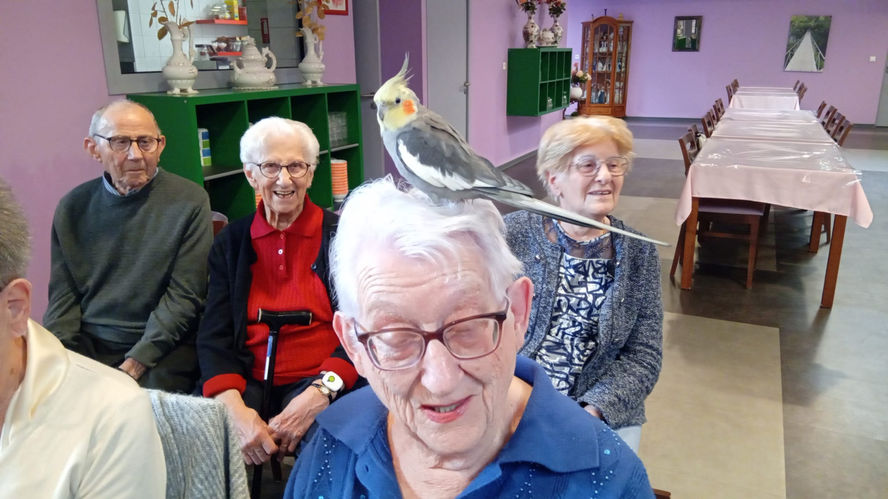 Cet après-midi, la résidence a reçu la visite de la compagnie anim' à lier qui a réalisé et présenté le spectacle avec de nombreux oiseaux pour le plaisir des résidents qui ont pu les observer et même les toucher.